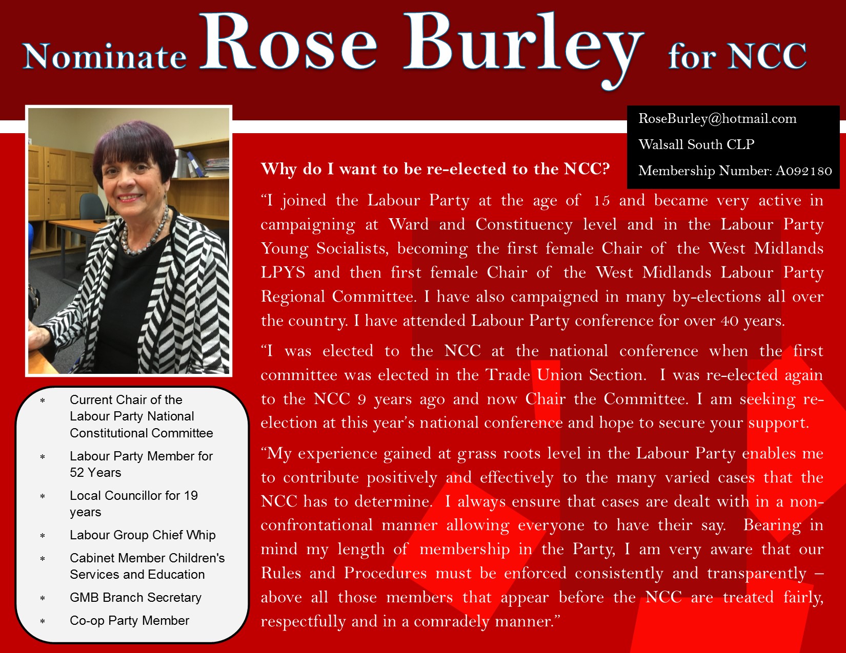 The National Constitutional Committee (NCC) deals with disciplinary cases involving Labour members. The NCC consisted of 11 members, four of whom represent Constituency Labour Parties (CLPs) with the others representing Trade Unions and Socialist Societies. Each CLP is entitled to nominate up to six members to stand for these new positions. Candidates with a minimum of five years of continuous party membership immediately prior to their election are eligible to stand and require a nomination from their home CLP. NCC members are elected at Annual Conference.